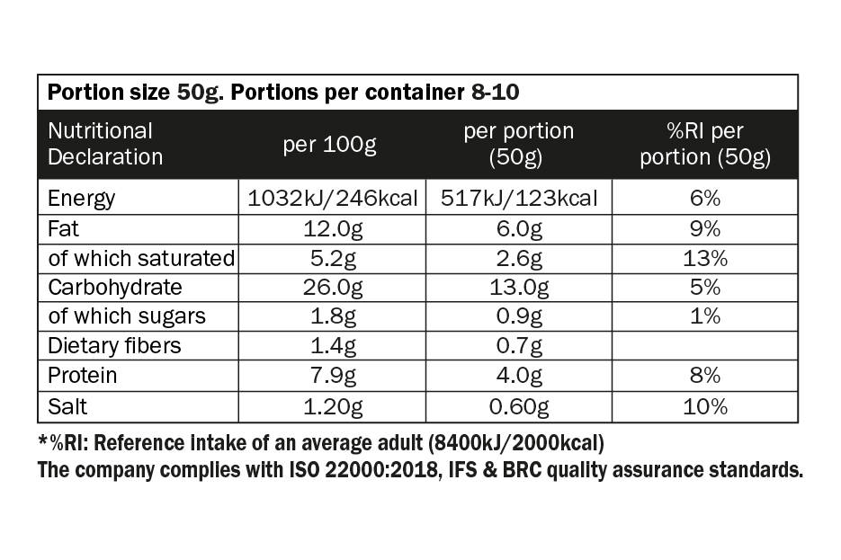 Whey cheese (myzithra) 35%, water, feta cheese P.D.O. 22.5%, wheat semolina, modified starch, egg white powder, corn semolina, salt, black pepper.